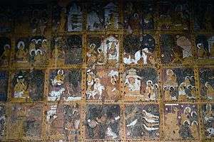 The Gubyaukgyi temple has 547 well-preserved paintings depicting various Jātakas, or stories of Buddha's previous lives. Each of these paintings has an ink caption written in Old Mon; in fact, Gubyaukgyi's murals with their accompanying captions are the most complete collection of Jātakas in Old Mon in the world.[7] Each panel in the mural measures 1' 5" by 1' 5".[5] The Jātaka panels begin on the third row of paintings on the eastern, outer wall of the vestibule, to one's immediate left as one enters the temple's entrance (the left as one enters). They then wrap around (south to west to north to east) seven times, ending on the ninth row of paintings on the outer wall. Unlike Jātaka paintings seen in other Bagan temples, such as the Ananda Temple, Gubyaukgyi's are unnumbered; the paintings' good condition and detailed captions have made identification simple, however.[9]