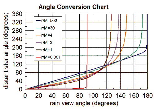 - At r/M=0.001, the curve of distant star angle versus view angle appears to form a right angle at the 90 degrees view angle. Almost all of the star images are congregated in a narrow ring 90 degrees from the radially inward direction. Between the ring and the radially inward direction is the enormous black hole. On the opposite side, only a few stars shine faintly.