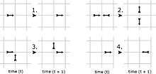 - Each lattice grid cell can only contain a maximum of one particle for each direction, i.e., contain a total of between zero and four particles.