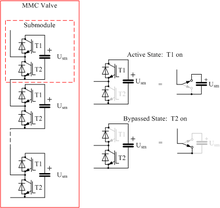 ![]() Operating principle of Modular Multi-Level Converter (MMC) for HVDC, with four series-connected submodules per valve. For clarity only one phase of the three is shown. |