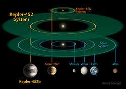 138. Jenkins, Jon M.; Twicken, Joseph D.; Batalha, Natalie M.; Caldwell, Douglas A.; Cochran, William D.; Endl, Michael; Latham, David W.; Esquerdo, Gilbert A.; Seader, Shawn; Bieryla, Allyson; Petigura, Erik; Ciardi, David R.; Marcy, Geoffrey W.; Isaacson, Howard; Huber, Daniel; Rowe, Jason F.; Torres, Guillermo; Bryson, Stephen T.; Buchhave, Lars; Ramirez, Ivan; Wolfgang, Angie; Li, Jie; Campbell, Jennifer R.; Tenenbaum, Peter; Sanderfer, Dwight; Henze, Christopher E.; Catanzarite, Joseph H.; Gilliland, Ronald L.; Borucki, William J. (23 July 2015). "Discovery and Validation of Kepler-452b: A 1.6 R⨁ Super Earth Exoplanet in the Habitable Zone of a G2 Star". The Astronomical Journal. 150 (2): 56. arXiv:1507.06723Freely accessible. Bibcode:2015AJ....150...56J. doi:10.1088/0004-6256/150/2/56. ISSN 1538-3881. Retrieved 24 July 2015.