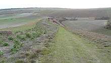 Hackpen Hill bowl barrow is a Bronze Age barrow a few metres north of Hackpen Down. It is approximately 21 metres in diameter and 1.4 metres high, surrounded by a quarry ditch from which material was taken to construct it, but which is now largely infilled. There is a depression at the top probably caused by an excavation by antiquarians, although no record of this survives. It is a Scheduled monument, and its grid reference is SU 3510 8518.[3]