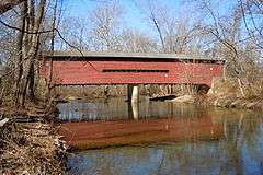 Hall's Bridge, also known as Sheeder-Hall Bridge, is a historic wooden covered bridge located in East Vincent Township and West Vincent Township, Chester County, Pennsylvania. It has two spans and is a 100-foot-long (30 m), Burr truss bridge, constructed in 1850. It is the oldest covered bridge in Chester County. It crosses Birch Run.[2]