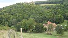 Rather a great deal of Hallgarten’s mediaeval history has to do with Montfort Castle, a major military stronghold in the local area shared by a number of lordships. The Montfort ruin is among the Palatinate’s most impressive castle remnants. Lying today in a secluded woodland away from main highways some 10 km west of Bad Münster am Stein-Ebernburg, the castle was built by the Counts of Veldenz about 1200 to keep watch upon a nearby army road. The origin of the name – which means “strong mountain” (albeit in French, not German) – is uncertain. It could have been brought back by Crusader knights from the Holy Land, where the Teutonic Knights owned a mighty castle, also named "Montfort Castle" (“מבצר מונפור”), which now lies within Israel, and which is also a ruin. The first known, and perhaps also the most important, dweller at the castle was Eberhard von Lautern (1182-1240). He was the father of his line, the Montforts. His son was the first to name himself “Knight of Montfort”. He held important Ämter in the Palatinate, and in 90 centres in the Eastern Palatinate and Rhenish Hesse, he also held great – and small – landholds. The knights were well respected and landed, and it was therefore not really necessary for them to behave as robber knights, as some of their contemporaries felt free to accuse them of doing. As a coat of arms, they bore an escutcheon that could be described as “Azure a bend countercompony sable and argent” (at right). Various knights bore these arms, either undifferenced or with marks of cadency. This noble house died out in 1432. The earliest known document, from 1226, and the next after that make it clear that Montfort Castle was very early on also inhabited by other knightly families, which made it a Ganerbenburg, or jointly held castle. The joint holders (Ganerben) each acquired through marriage or sale a castle house as an hereditary property, somewhat like a modern-day condominium. This afforded considerable personal protection in uncertain times, and for the castle itself, the presence of several defence forces – one kept by each lord – made for a much stronger military presence than was usual for such a stronghold. Joint rulers’ agreements still survive to which as many as 25 parties were signatory (although later in the castle’s history, this had shrunk to 17), which would seem to be proof that the castle’s population was roughly 150, and thus far greater than that in any of the surrounding villages. Living together in a tightly bordered castle area was regulated by very strict rules, an arrangement known as a Burgfrieden ("castle peace", a term later used in early-20th-century German politics, albeit in a modified sense). This agreement laid down the yearly contributions to the castle’s maintenance as well as the kinds and numbers of weapons needed to defend the castle and the food that was needed.[5] The concentrated fighting force of such a great number of knights and their servants was surely what kept Montfort Castle from facing any serious attack or siege, at least as far as history records up to 1456. It took Archbishop of Mainz Diether’s and Elector Palatine Friedrich I’s vastly superior fighting forces to conquer and destroy the castle on 19 October of that year, with firearms, after a five-day siege. It was, however, more the castle’s overlord, Duke Ludwig the Black of Palatinate-Zweibrücken who was “damaged” rather than the castle itself. The only part of that that ever rose again was one of the dwelling towers. One of the joint holders who had been driven out, Sir Boos von Waldeck, built himself the Neues Schloss – "New Castle" – in the dale out of rubble from the destroyed old castle. This laid the groundwork for today’s hamlet of Montforter Hof (or Montforterhof). Montfort Castle, such as it now is, represents quite a rare example in Germany of a mediaeval castle, forsaken at the muzzles of cannon, whose 12th-to-15th-century structures are still clearly visible even now, and whose appearance was never altered in later times by modernization or reinforcement against firearms.[6]
