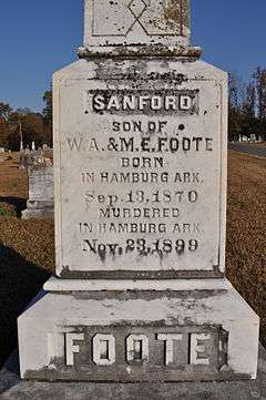 Hamburg Cemetery is the main cemetery of Hamburg, Arkansas. It is located on the east side of the city, south of Arkansas Highway 8 (East Parker Street). Hamburg was established in 1848, and the first burial was recorded in the cemetery in 1859. It has since become the burial site for many of Hamburg's leading citizens.[2]