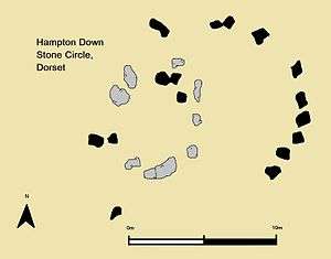 The area of modern Dorset has only a "thin scatter" of stone circles,[13] with nine possible examples known within its boundaries.[14] The archaeologist John Gale described these as "a small but significant group" of such monuments,[14] and all are located within five miles of the sea.[3] All but one—Rempstone Stone Circle on the Isle of Purbeck—are located on the chalk hills west of Dorchester.[15] The Dorset circles have a simplistic typology, being of comparatively small size, with none exceeding 28 metres in diameter.[16] All are oval in shape, although perhaps have been altered from their original form.[17] With the exception of the Rempstone circle, all consist of sarsen stone.[15] Much of this may have been obtained from the Valley of Stones, a location at the foot of Crow Hill near to Littlebredy, which is located within the vicinity of many of these circles.[18] With the exception of the circle at Litton Cheney, none display evidence of any outlying stones or earthworks around the stone circle.[19]