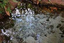 The spring flows as a stream for approximately one kilometre in the Hamurana Springs Reserve through a patch of redwoods forest before joining Lake Rotorua.[1] In summer the stream is home to rainbow trout who prefer the cooler temperature of the spring water.