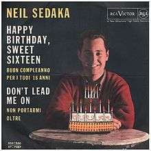 "Happy Birthday Sweet Sixteen" is a pop song released in 1961 by Neil Sedaka. Sedaka wrote the music and performed the song, while the lyrics were written by Howard Greenfield. The song is noted for being similar in musical structure to Take Good Care of My Baby by Bobby Vee (another 1961 hit), and additionally for its resemblance to the melody of the Chiffons' subsequent 1963 hit "One Fine Day". Both of these songs exhibiting similarity to "Happy Birthday Sweet Sixteen" were penned by the team of Carole King and Gerry Goffin. The song reached #6 on the Billboard Hot 100 chart[1] and no 3 on the UK Singles Chart.