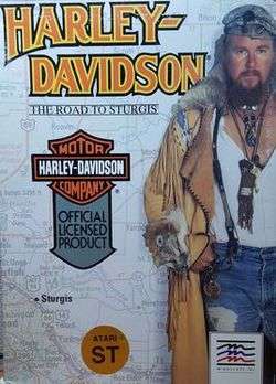 Harley Davidson:The Road to Sturgis, is a video game produced by Mindscape, Inc.[1] in 1989. The game received mixed reviews after its release, some gamers citing the graphics as better than average, and others disappointed in how quickly the game became "tedious" and "repetitive" and could be beaten. The point of the game is to get to the annual motorcycle rally in Sturgis in 10 days. To get there you must ride on the highway, avoiding obstacles and stopping at pit stops.[2]