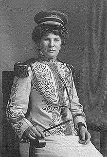 In 1891, Butler formed her own orchestra, the Talma Ladies Orchestra, performing privately at the houses of the well-to-do.[2] Butler wanted to lead a band that could perform in public venues, but at the time such activities were not considered appropriate for young women.[2] The popular military bands of the time, in particular, developed from a strongly male tradition and generally excluded women well into the 20th century.[1] So in 1898, Butler went ahead and formed a new group with different instrumentation, the U.S. Talma Ladies Military Band.[5][6] It initially numbered less than two dozen members but later grew to a core of 25–35 women, occasionally swelling to as many as 60 for special occasions.[5] The women dressed in elegant military-styled uniforms with ostrich-plumed tricorne hats.[5] In addition to the traditional brass instruments, the band included a woodwind section.[5]