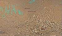 Some regions of the upper plains unit display large fractures and troughs with raised rims; such regions are called ribbed upper plains. Fractures are believed to have started with small cracks from stresses. Stress is suggested to initiate the fracture process since ribbed upper plains are common when debris aprons come together or near the edge of debris aprons—such sites would generate compressional stresses. Cracks exposed more surfaces, and consequently more ice in the material sublimates into the planet's thin atmosphere. Eventually, small cracks become large canyons or troughs. Small cracks often contain small pits and chains of pits; these are thought to be from sublimation of ice in the ground.[18][19] Large areas of the Martian surface are loaded with ice that is protected by a meters thick layer of dust and other material. However, if cracks appear, a fresh surface will expose ice to the thin atmosphere.[20][21] In a short time, the ice will disappear into the cold, thin atmosphere in a process called sublimation. Dry ice behaves in a similar fashion on the Earth. On Mars sublimation has been observed when the Phoenix lander uncovered chunks of ice that disappeared in a few days.[22][23] In addition, HiRISE has seen fresh craters with ice at the bottom. After a time, HiRISE saw the ice deposit disappear.[24]