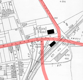 1898 OS map showing the location of Hemel Hempstead station (modern road layout is overlaid in red with station and the Midland Hotel marked) | |