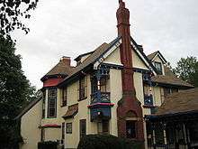 The Henry Bradlee Junior House is located in Medford, Massachusetts. It was designed in the Queen Anne style by Peabody & Stearns circa 1881-1882. This was one of three houses built by the Halls and the Bradlees on their estate.