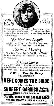 Here Comes the Bride is a lost[1] 1919 American silent comedy film produced by Famous Players-Lasky and released by Paramount Pictures. This film is based on the 1917 Broadway play Here Comes the Bride by Max Marcin and Roy Atwell. The film was directed by John S. Robertson and stars John Barrymore.[2][3][4][5][6]