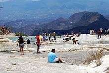 Hierve el Agua (Spanish for "the water boils") is set of natural rock formations in the Mexican state of Oaxaca that resemble cascades of water. The site is located about 70 km east of Oaxaca city, past Mitla,[1] in the municipality of San Lorenzo Albarradas, with a narrow, winding unpaved road leading to the site.[2] The site consists of two rock shelves or cliffs which rise between fifty and ninety metres from the valley below, from which extend nearly white rock formations which look like waterfalls. These formations are created by fresh water springs, whose water is over-saturated with calcium carbonate and other minerals. As the water scurries over the cliffs, the excess minerals are deposited, much in the same manner that stalactites are formed in caves. One of the cliffs, called the "cascada chica" (small waterfall) or the Amphitheatre, contains two large artificial pools for swimming as well as a number of small natural pools.[3][4] One of the artificial pools is very near the edge of the cliff.[1]