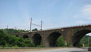 While the PRR had been using steel bridges since the 1880s,[5] and was constructing others nearby at the time, such as the High Bridge at Downingtown,[6] President A. J. Cassatt decided in favor of a stone bridge at this location and elsewhere. This reflected the influence of PRR Chief Engineer William H. Brown,[5] who rebuilt many of the railroad's bridges in masonry during his tenure.[7] While more expensive than steel, Brown felt that stone bridges were stronger and more durable,[8] and less expensive to maintain in the long term.[5]