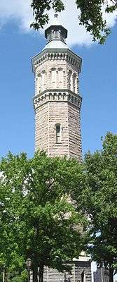 The High Bridge Water Tower, located in the park between West 173rd and 174th Streets, was built in 1866-72 to help meet the increasing demands on the city's water system. The 200-foot-tall octagonal tower was designed by John B. Jervis in a mixture of Romanesque Revival and neo-Grec styles, and was accompanied by a 7-acre reservoir. The High Bridge system was inaugurated in 1872, and reached its full capacity by 1875.[10] With the opening of the Croton Aqueduct, the High Bridge system became less relied upon; during World War I it was taken out of service when sabotage was feared.[10] In 1949 the tower was disconnected from the system,[10][11] and a carillon, donated by the Altman Foundation, was installed in 1958.[10] The tower's cupola was damaged by an arson fire in 1984. The tower and cupola were rehabilitated and restored in 1989-90.[10]
