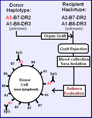 In the tables a fortuitous transplant between two unrelated individual has resulted in an antiserum to single alloantigen. By discovering these close-but-non-identical matches, the process with somewhat related haplotypes surface antigens were identified for HLA A, and in the table below, HLA B at the time however these were all grouped together as HL-Antigens. On the left the "B" and "cw" antigens are matched (B and C are close together so if B matches then C likely also matches), but A antigens are not matched. The antisera that is produced by the recipient is most likely to be A3, but if the direction of transplant is reversed A2 is the likely alloantigen. Two of the first three alloantigens are thus readily easy to detect because of the similarity and frequency of the A2-B7 and A3-B7 haplotypes (see example 1).
