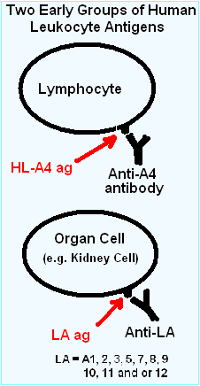 As the study of these 'rejection' sera and "allo"-antigens progressed, certain patterns in the antibody recognition were recognized. The first major observation, in 1969, was that an allotypic antibodies to "4" ("Four") was only found on lymphocytes, while most of the antigens, termed "LA", recognized most cells in the body.[15]