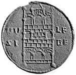 | O: Diademed bust right, with cross in front. | R: Coiled wolf with curled tongue facing right. |