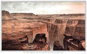 More than a decade after the Ives Expedition and with help from the Smithsonian Institution, Powell led the first of the Powell Expeditions to explore the region and document its scientific offerings.[6] On May 24, 1869, the group of nine men set out from Green River Station in Wyoming down the Colorado River and through the Grand Canyon.[2] This first expedition was poorly funded and consequently no photographer or graphic artist was included. While in the Canyon of Lodore one of the group's four boats capsized, spilling most of their food and much of their scientific equipment into the river. This shortened the expedition to one hundred days. Tired of being constantly cold, wet and hungry and not knowing they had already passed the worst rapids, three of Powell's men climbed out of the canyon in what is now called Separation Canyon.[17] Once out of the canyon, all three were reportedly killed by Shivwits band Paiutes who thought they were miners that recently molested and killed a female Shivwit.[17] All those who stayed with Powell survived and that group successfully ran most of the canyon.