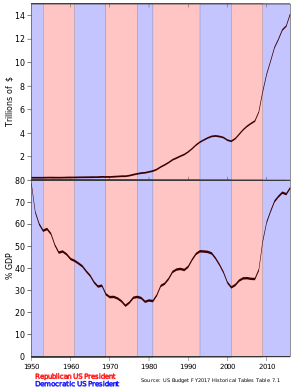 Economist Mike Kimel has noted that the former Democratic Presidents (Bill Clinton, Jimmy Carter, Lyndon B. Johnson, John F. Kennedy, and Harry S. Truman) all reduced public debt as a share of GDP, while the last four Republican Presidents (George W. Bush, George H. W. Bush, Ronald Reagan and Gerald Ford) all oversaw an increase in the country's indebtedness.[37] Economic historian J. Bradford DeLong, observed a contrast not so much between Republicans and Democrats but between Democrats and "old-style Republicans (Eisenhower and Nixon)" on one hand (decreasing debt) and "new-style Republicans" on the other (increasing debt).[38][39] David Stockman, former director of the Office of Management and Budget, blamed the "ideological tax-cutters" of the Reagan administration for the increase of national debt during the 1980s.[40] Former Treasury official Bruce Bartlett attributed the increase in the national debt since the 1980s to the policy of "starve the beast".[41][42] While noting that George H.W. Bush's budget deal in 1990 was one of the reasons for improvement of the fiscal situation in 1990s, Bartlett was highly critical of George W. Bush for creating budget deficits by reducing tax rates and increasing spending in the early 2000s.[43][44]