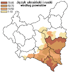 After the Polish-Ukrainian War, the eastern part of Galicia and Volhynia were captured by Poland. Ukrainian leaders at that time were retained a strong sense of honor.[9] During the entire time of its existence, there were no cases of mass repressions against national minorities in territories held by the West Ukrainian government;[10] the Ukrainian forces controlling the city even neglected to arrest Polish nationalist leaders and intelligentsia, enabling the latter to rebel against the Ukrainian government.[9] Polish forces captured Lviv after a week-long battle with the Ukrainians. They were fired at in the streets by civilians when they entered the city, and retaliated. They burned the Ukrainian and Jewish sections and killed approximately 270 Ukrainians; however, the British mission also noted that there were no clear conclusions as to the specific motive behind the massacre.[11] The percentage of Jews killed corresponds to the demographics in Lviv at that time.[12] In the eastern half of Galicia, Ukrainians made up approximately 65% of the population while Poles made up 22% of the population and Jews made up 12%.[13] Of the 44 administrative divisions of Austrian eastern Galicia, Lviv (Polish: Lwów, German: Lemberg), the biggest and capital city of the province, was the only one in which Poles made up a majority of the population.[14] Ukrainians represented about 16% of the total population of the pre-war Poland. Over 90% of them lived in the countryside, 3–6 percent were industrial workers, and close to 1% belonged to Intelligentsia.[15] As to religion, 60 percent were Uniate Catholics and 39 percent professed Orthodox faith.[16] While national consciousness among the Galician Ukrainians was very strong, the Ukrainians of Volhynia were largely influenced by strong Russophile trends and had pro-Soviet sympathies, while having little national inclination[17][18] According to Polish census of 1931 the following areas hosted a large number of Ukrainian population in Poland: