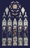 The east window commemorates the Thomas family famous for its national industrial achievements in the founding of the South Wales Steel Industry, and having begun in a modest way at the Lydbrook Tin Works. The window depicts the four evangelists - Matthew, Mark, Luke and John, with Christ the King at the centre. Below each of the Evangelists is an Angel holding a shield portraying the Evangelist's symbol. Below Christ are two Angels holding a shield bearing his name (IHS = JES). Above the Risen Christ is the Holy Spirit in the form of a Dove radiating down. To each side of the Dove is an Angel, respectively holding shields bearing the initials Alpha and Omega. Originally the Window was provided by Richard and Ann Thomas in memory of their children. The original inscription on the brass plaque ran "To the Glory of God, and in memory of the following members of the Thomas Family - William George, Sydney Lovelock and Ann Lillian, who rest in this Churchyard, Samuel Treherne and Alfred Ivor, interred at Lantwit, Neath, and Stanley Rendell, interred at the English Cemetery, Rome". The Window was dedicated 20 October 1908 by the Bishop of Gloucester. Sometime after 1917, with the deaths of Richard (1916) and Ann Thomas (1914), and Richard Beaumont and Elizabeth Mabel their children, a new plaque replaced the original with the additional names.