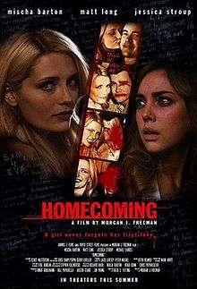 Homecoming is a 2009 American independent thriller film,[1] directed by Morgan J. Freeman and written by Katie L. Fetting, Jake Goldberger and Frank Hannah.[2] The film follows a student couple, Mike (Matt Long) and Elizabeth (Jessica Stroup), on their homecoming. Elizabeth is taken home by Mike's ex-girlfriend Shelby (Mischa Barton) after a road accident. Shelby is soon revealed to be fixated on Mike and subsequently treats Elizabeth in a cruel and deranged manner.