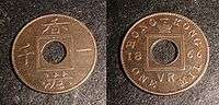 The one mil coin was the smallest denomination of the Hong Kong dollar from 1863 to 1866, after this date it was no longer issued but may have circulated much longer. Its value was one tenth of a cent, or a thousandth of a dollar. Despite being minted under British rule, they did not feature the reigning monarch as all other coins did, due to the hole in the middle.