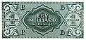 After the one billion milpengő note a new abbreviation had to be found out, since further higher denominations were necessary. This became the b.-pengő (which stands for billion pengő; billion is on the long scale i.e. million times million) and the designs could be reused again with changes in the color and adding "B" letters. The highest printed denomination - the one billion b.-pengő (i.e. 1021 pengő) note - was never released into circulation.