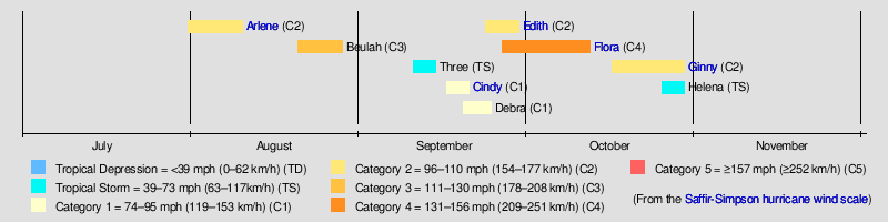 Tropical cyclogenesis began late, with Hurricane Arlene developing on July 31. Another system formed in August, Hurricane Beulah. September was much more active, with an unnamed tropical storm, as well as hurricanes Cindy, Debra, Edith, and Flora all developing in that month. Flora was the most intense tropical cyclone of the season, peaking as a Category 4 hurricane with winds of 145 mph (230 km/h) and a minimum barometric pressure of 940 mbar (27.76 inHg). There were two other system in October, Hurricane Ginny and Tropical Storm Helena; the latter dissipated on October 29.[2]