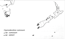 Since it is located in New Zealand as well as Australia, this indicates that the species predates Gondwanaland, suggesting that this species may be included as one of the earliest species to diverge from water to land and may give vital insight toward how vascular plants evolved.[19][20][21] Hypnodendron comosum var. sieberi is more commonly located on mainland Australia and the northern South Island of New Zealand, whereas H. c. var. comosum is more commonly located in Tasmania, the southern South Island of New Zealand, and the islands located in the southern ocean.[22]