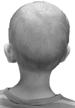 Hair growth on the head is noticeably less full than normal, and the hairs are very weak; the rest of the body shows normal hair.