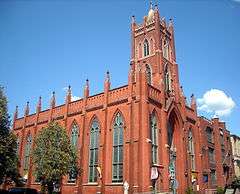The cornerstone of the original church, located on a lot near the corner of 8th and N Streets, Northwest took place on October 30, 1864. Martin John Spalding, Archbishop of Baltimore, dedicated the new church on July 2, 1865, the Feast of the Visitation (Christianity). The parish rapidly outgrew this structure, however, and on November 13, 1870 the cornerstone for the present Gothic Revival church was laid, with construction commencing the following year. It was dedicated in 1874, at which time the old structure became the parish and school hall. The church was refurbished in 1939 and 1962–3.[2]