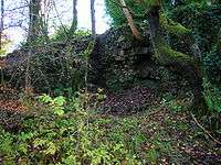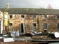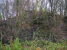 Ladyha No 2 pit was sunk in 1885 to a depth of 568 feet (173 m) and closed in May 1934, having struggled since its main customer, the Eglinton Iron Company, closed in 1928. A fairly substantial brick-lined tunnel still survives which once carried a standard gauge railway line unobtrusively to Ladyha colliery, out of the Earl's sight and the smoke kept away from the kitchen gardens' greenhouses and plants.[38] Other such 'cosmetic' tunnels exist at Alloway and near Culzean Castle.[39] The tunnel was used during World War II as a bomb shelter and storage area for 'furniture'; it remains in good condition. The old colliery ruins were 'raised to the ground' in 2011 having been assessed as a danger to the public.