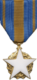 Currently, the most commonly worn medal is uniface of gilt bronze, 30 mm in diameter and consists of a white enamel star encircled by a wreath of oak and laurel leaves. The medal is hangs from a ribbon of blue and yellow. When the ribbon bar is worn alone it containts a white star clasp.