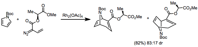 Pyrroles react with vinyl diazoacetates to form nitrogen-bridged cycloheptadienes. The use of methyl lactate as a chiral auxiliary on the vinyl diazoacetate led to moderate diastereoselectivity in the tandem cyclopropanation/Cope rearrangement of Boc-protected pyrrole.[23]