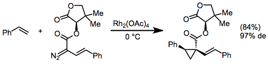 Chiral auxiliaries derived from readily available chiral alcohols (such as pantolactone) may be used for diastereoselective cyclopropanations with diazo esters.[11]