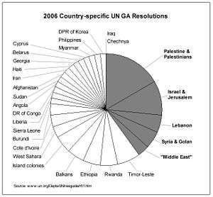 These decisions often criticize Israel for its "occupation of Palestinian land and its oppression of Palestinians." A number of observers have described this criticism as excessive. For example, according to the UN Association of the UK, General Assembly resolutions in the period 1990–2003 show bias against Israel, condemnation of violence against Palestinians, but only occasional discussion of violence against Israelis.[5] In addition, the UNHRC was criticized in 2007 for failing to condemn other alleged human rights abusers besides Israel.
