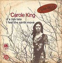 "It's Too Late" is a song from Carole King's 1971 album Tapestry. Toni Stern wrote the lyrics and King wrote the music. It was released as a single in April 1971 and reached number 1 on the Billboard Hot 100 and Adult Contemporary charts. Sales were later certified Gold by the RIAA. Billboard ranked "It's Too Late" and its fellow A-side, "I Feel the Earth Move", as the No. 3 record for 1971.