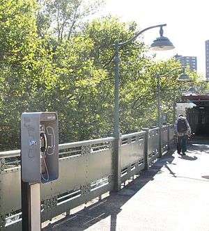 This station has been listed on the National Register of Historic Places since September 17, 2004.[13] The 2009 artwork here is called Latin American Stories by George Crespo. It consists of four stained glass panels on the windscreens of each platform and two sets of window niches on each station house. They depict images from six Latin American stories, including How Fire Came to the Rain Forest and The King That Tried to Touch the Moon from the Lesser Antilles.[14]
