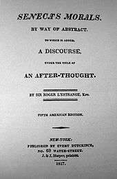 In 1817 Paul received an order from the prominent New York bookseller Evert Duyckinck for 2,000 copies of an English translation of Seneca's Morals ("Seneca's morals by way of abstract", translated by Roger L'Estrange and first published in England in 1678.) Paul gave the order to his young apprentices, James and John, who did the printing, working with their younger brothers Joseph Wesley (25 December 1801 – 14 February 1870)[2] and Fletcher (31 January 1806 – 29 May 1877)[2] who aided in setting type, and issued it under the imprint J. & J. Harper. This book was followed in 1818 with an edition of John Locke's An Essay Concerning Human Understanding (1818), which they issued under the J. & J. Harper imprint as publisher rather than merely printer.