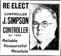 Simpson was a Methodist and Christian Socialist who became active with the Epworth League movement at the age of 16 ultimately becoming president of the Epworth League Toronto Conference. He also served as president of the Toronto Methodist Young People's Union and the Toronto Methodists' Cycling Union.[1] Simpson was intensely anti-Catholic which cost him the support of the Toronto Star. When he ran for re-election as mayor in 1936 this contributed to his defeat.