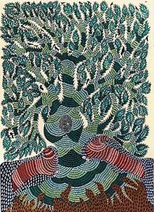 Jangarh Singh Shyam (1962–2001) was a pioneering contemporary Indian artist credited with being the creator of a new school of Indian art called ‘Jangarh Kalam’. His work has been exhibited widely the world over including Bhopal, Delhi, Tokyo and New York. His most notable exhibitions include the Magiciens de la Terre in Paris (1989) and Other Masters curated by Jyotindra Jain at the Crafts Museum, New Delhi (1998). His 1988 piece Landscape with Spider sold for $31,250 at Sotheby’s, New York, in 2010—a first for an adivasi artist.[1] Jangarh had also painted the interiors of the Legislative Assembly of Madhya Pradesh, the Vidhan Bhavan, and the dome of Bhopal’s Bharat Bhavan—one of the most prestigious museums of tribal and contemporary Indian art. He was among the first Gond artists to use paper and canvas for his paintings, thereby inaugurating what is now known as ‘Jangarh Kalam’.[2]