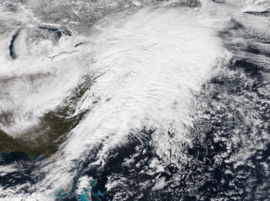 ![]() Satellite image of the large winter storm moving off the East Coast early on February 2. Snow from the system can be seen on the left. | |