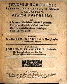 Jeremiah Horrocks (1618 – 3 January 1641), sometimes given as Jeremiah Horrox (the Latinised version that he used on the Emmanuel College register and in his Latin manuscripts),[1] was an English astronomer. He was the first person to demonstrate that the Moon moved around the Earth in an elliptical orbit; and he was the only person to predict the transit of Venus of 1639, an event which he and his friend William Crabtree were the only two people to observe and record.