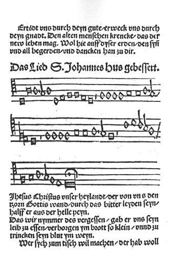In Luther's time "Jesus Christus nostra salus" was attributed to the church reformer Jan Hus (a "Johannes" like Jenštejn).[3] Luther saw Hus as a precursor and martyr. Early prints of "Jesus Christus, unser Heiland, der von uns den Gotteszorn wandt" came under the header "Das Lied S. Johannes Hus gebessert" (The song of St. Johannes Hus improved).[3] Luther presented the hymn with several variants of the melody that had been associated with "Jesus Christus nostra salus" for over a century.[2][6]