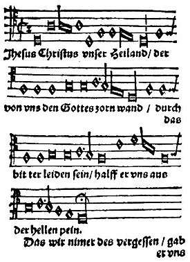 For their hymns, Luther and the circle around him chose either to compose a new melody, or to borrow an older melody from Latin religious chant, or to adopt a melody from folk-song tradition. "Jesus Christus unser Heiland, der von uns" falls in the second of these categories. Characteristically for such melodies it did not fit easily in the then prevailing mensural notation system, leading to several rhythmic variants in the successive publications of the melody.[6]