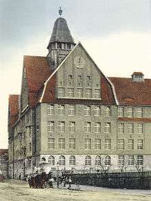 The city council advertised a competition for planning and designing the new building. 104 concepts were turned in and the design "Fritz und Elly" by the architects Adolf Alfred Christian Zapp and Erich August Leo Basarke persuaded the jury the most. They received a prize of 3000 marks. The architect’s office was put in charge of building the schoolhouse by signing the contract on 3 February 1909. They planned to finish construction work around Easter 1910.[9] Having cost more than 750,000 marks, the school was inaugurated on 25 April 1910. 846 girls and 1345 boys enrolled and started school the next day.[10]
